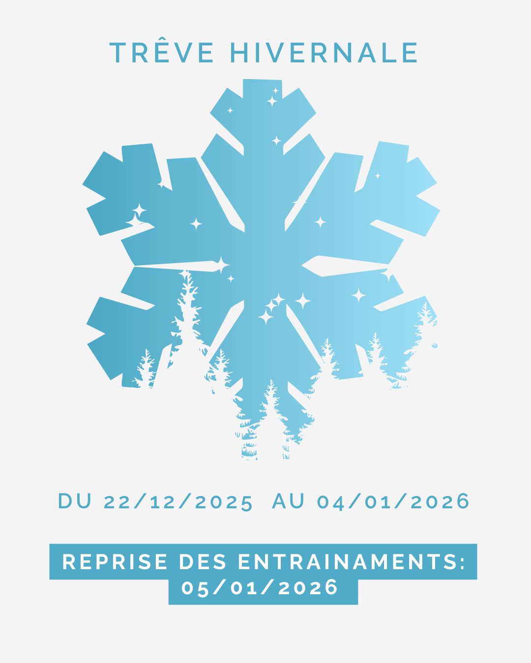 La reprise des entraînements se fera à partir du 5 janvier 2026. Nous vous encourageons à bien profiter de cette pause pour vous reposer et revenir en pleine forme pour la nouvelle année ! 💪
